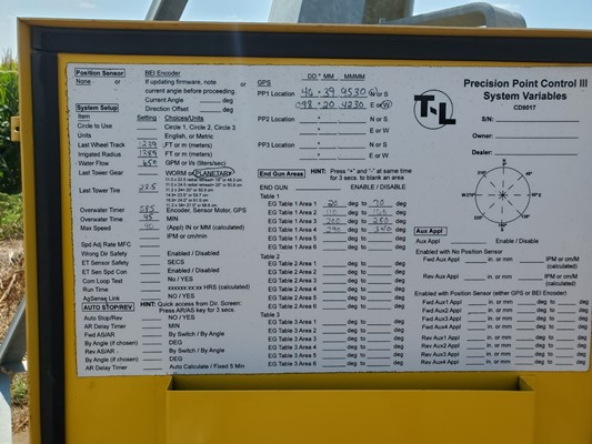 Equipment: 2011 T-L 8 tower center pivot, planetary drive, 14.9x24 tires, 650 gpm nozzles. Chevy 350 natural gas engine, Randolph 100 hp gearhead 5:4 ratio. Chevy V6 Vortek 4.3 natural gas engine, Amarillo 40 hp gearhead 1:1 ratio