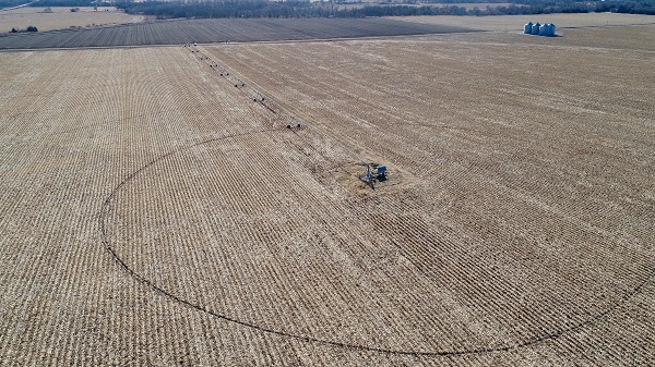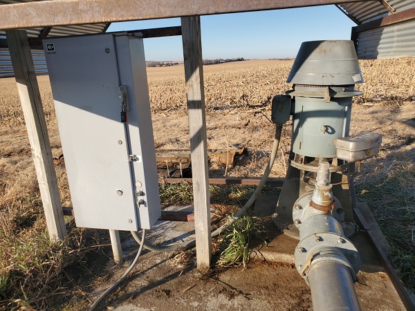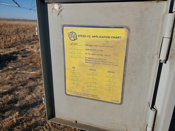 Equipment: 2001 T-L 8 tower center pivot w/ drop nozzles set at about 800 gpm & 14.9x24 tires/ US Motors 60 hp electric motor on 8” well drilled in 1970/ 15 hp motor at pivot point for wheel service/ flow meter
