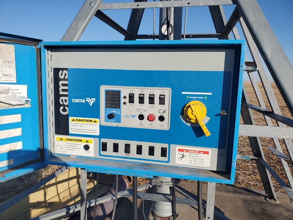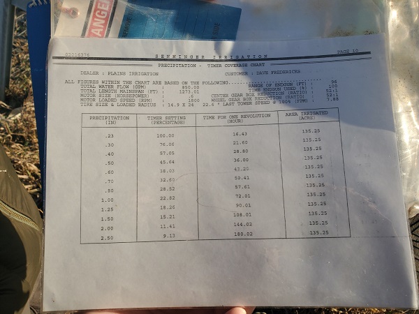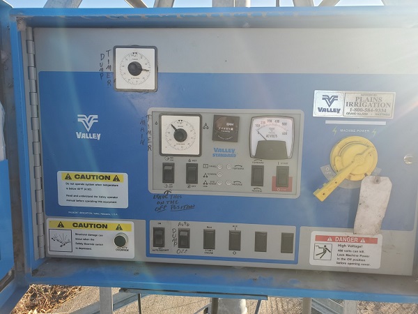 Equipment: 2000 Valley 8 tower center pivot, impact sprinklers set at about 850 gpm, 14.9x24 tires, dump valve w/ timer/ Newman 60 hp electric motor on 8” well drilled in 1998/ flow meter