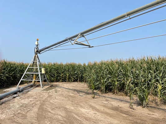Equipment: 2013 T-L 7 tower center pivot, Precision III controller, 5,060 hours showing at time of data gathering. 1,299.4’ system, 90.6’ end gun radius, nozzled at 750 gpm, 35.0 psi at time of installation. Flow meter on 9/01/2021 read 800 gpm.