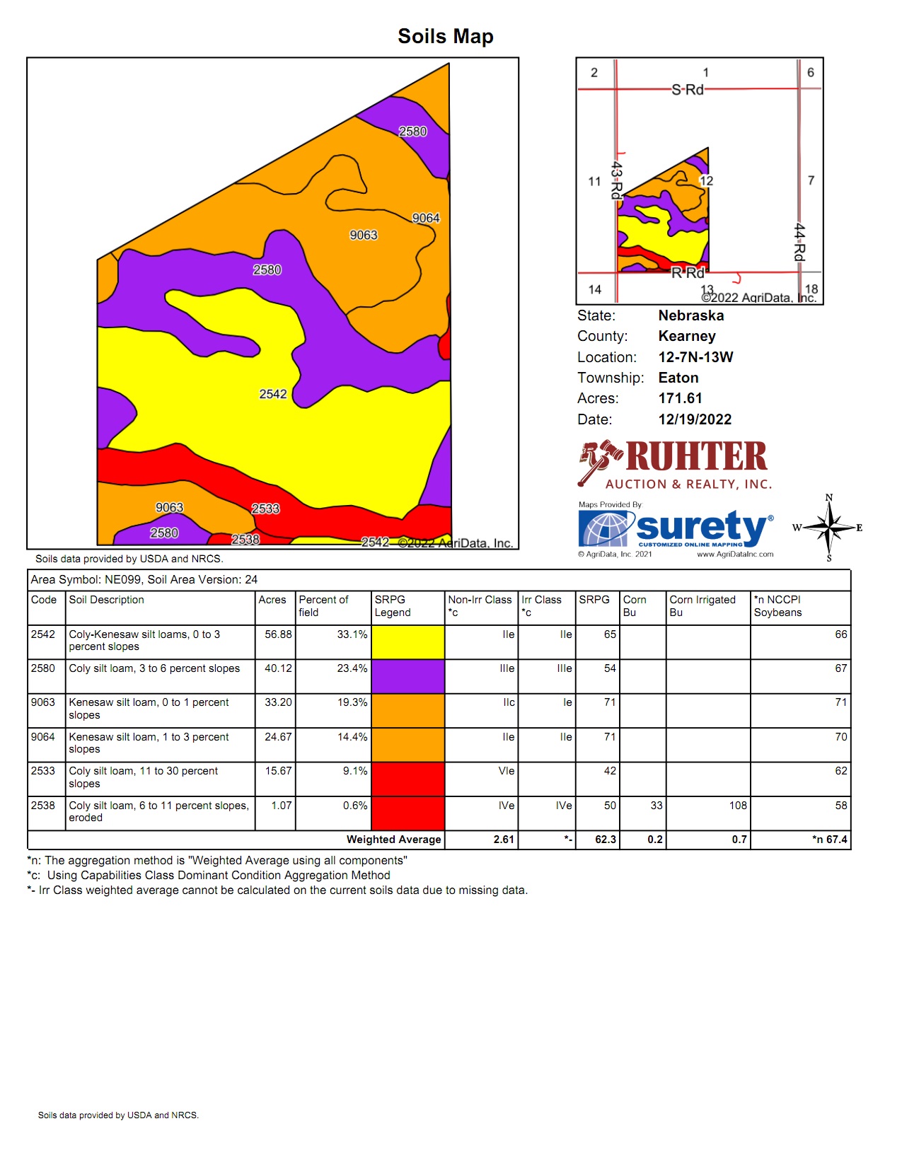 LEGAL DESCRIPTION: West half (W 1/2) on south side of RR, Section Twelve (12), Township Seven North (T7N), Range Thirteen West (R13W) of the 6th PM, Kearney County, Nebraska, 173.54 acres more or less according to survey.