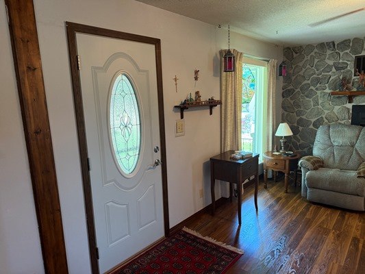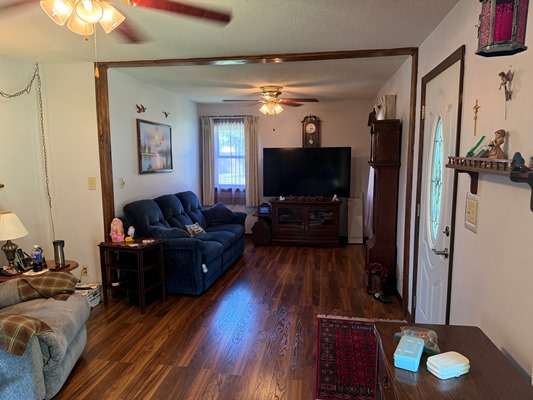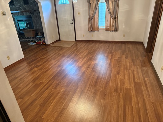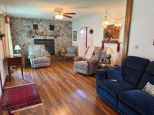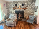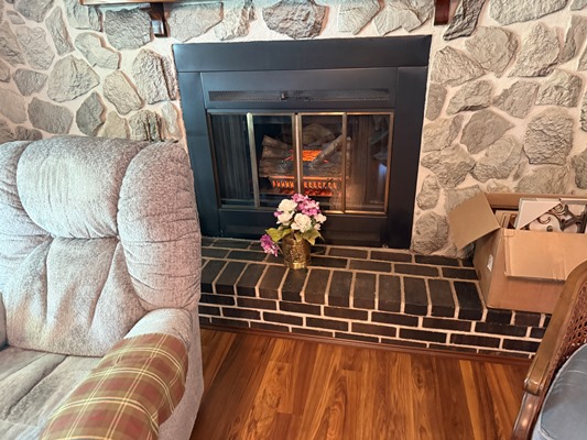 Living Room: 23’3” x 24’5” with natural wood accents (currently artificial log).